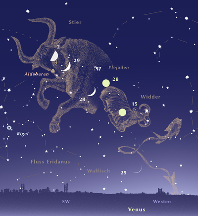 Während Venus sich entfernt von der untergehenden Sonne zieht sie vom Steinbock bis Widder. Sie bewegt sich schneller als die Sonne zum ostwärts stehenden Sternbild, zum Tierkreisbild das später untergeht.